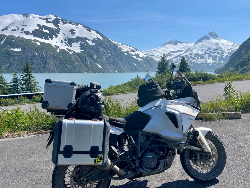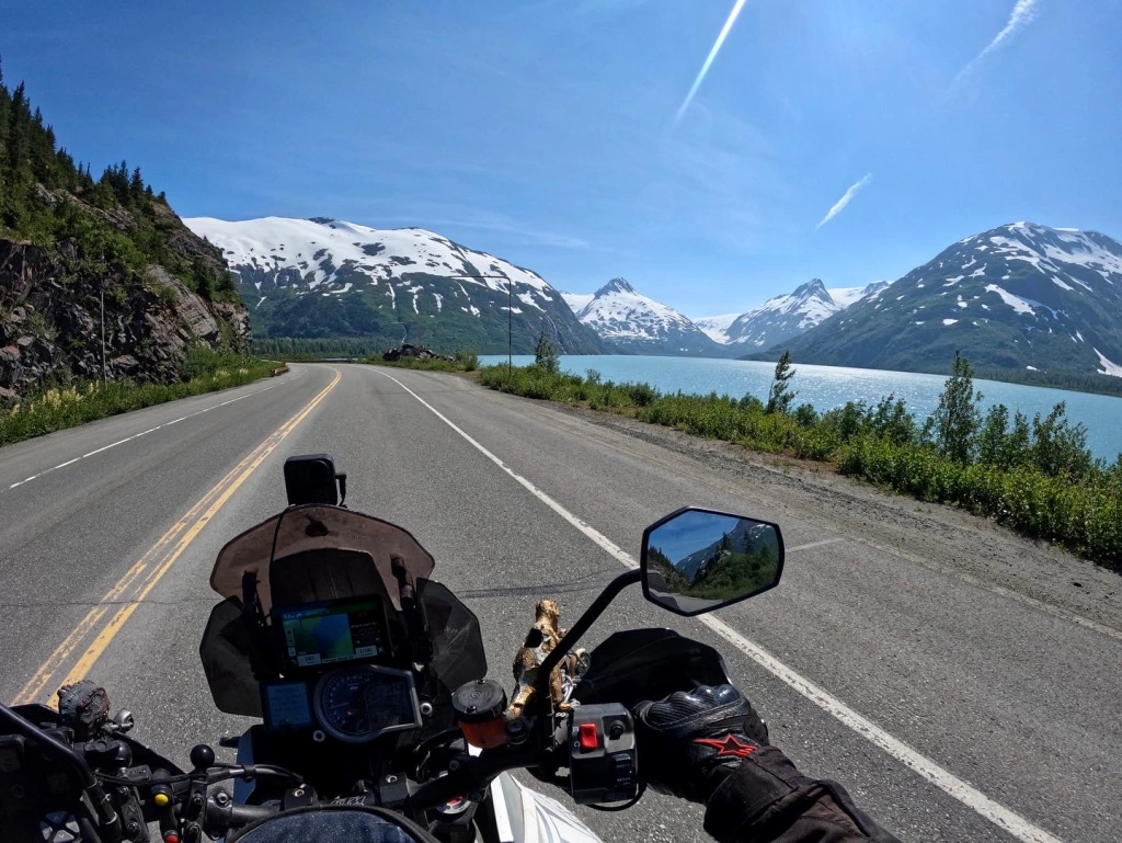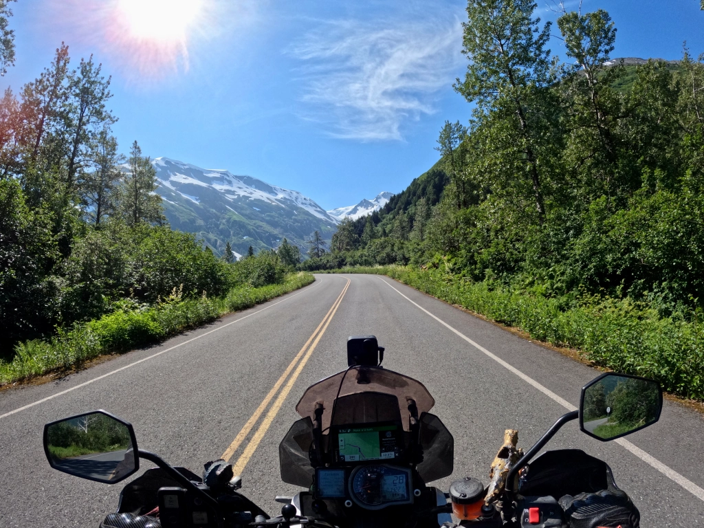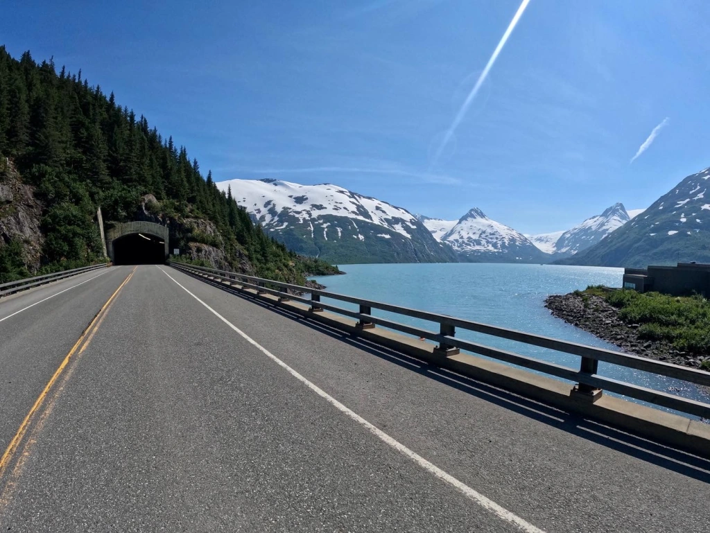 I took the opportunity to go check out Portage glacier and the town of Whittier. Portage glacier was just another beautiful mountain with a glacier on it towering over a ridiculously beautiful glacial lake….more of the usual. But visiting Whittier requires a trip through a tunnel. And not just any tunnel. A one lane tunnel. Traffic switches direction every half hour. And the tunnel has a metal floor and train tracks down the middle. Motorcycles have to ride between the tracks which is about 4ish feet. Getting too close to the track will pull your tire into the gap and almost certainly cause a crash. O yeah and the tunnel is 2.5 miles long. Perfectly. Straight. It was kinda tough but mostly fun.