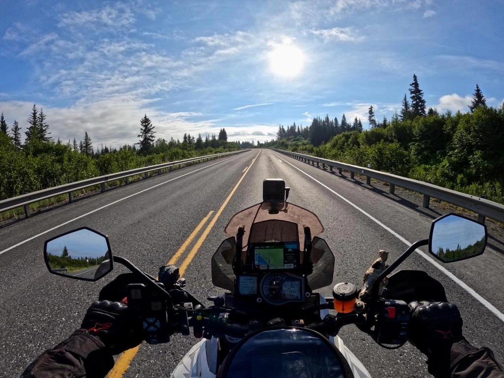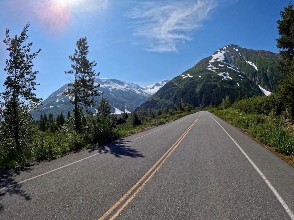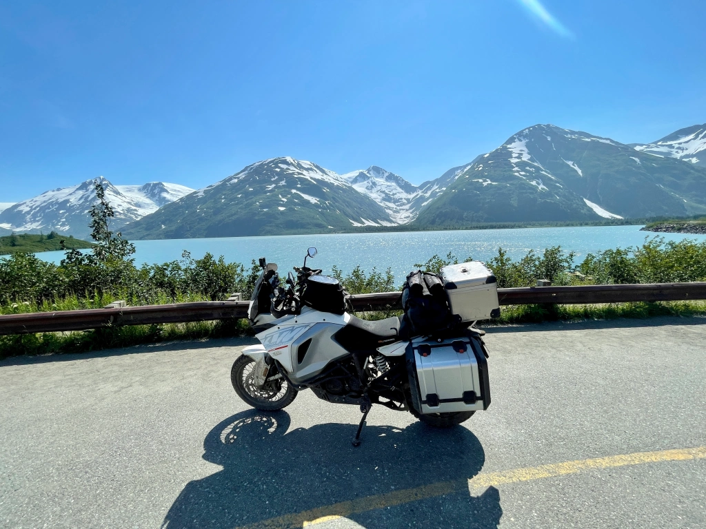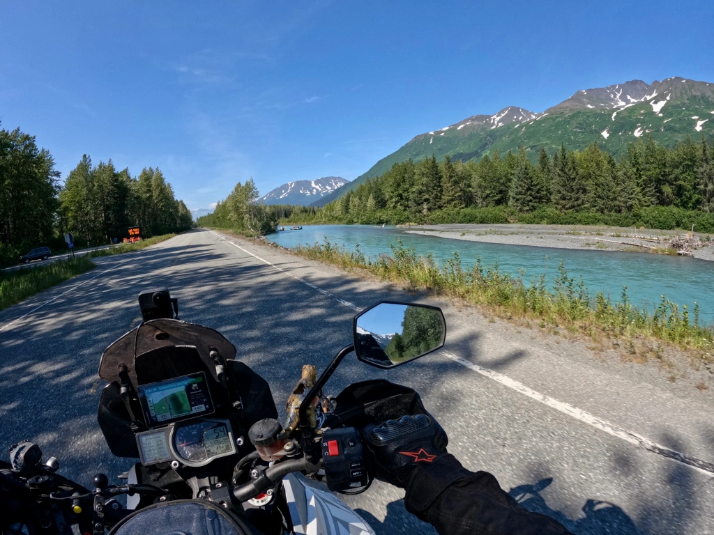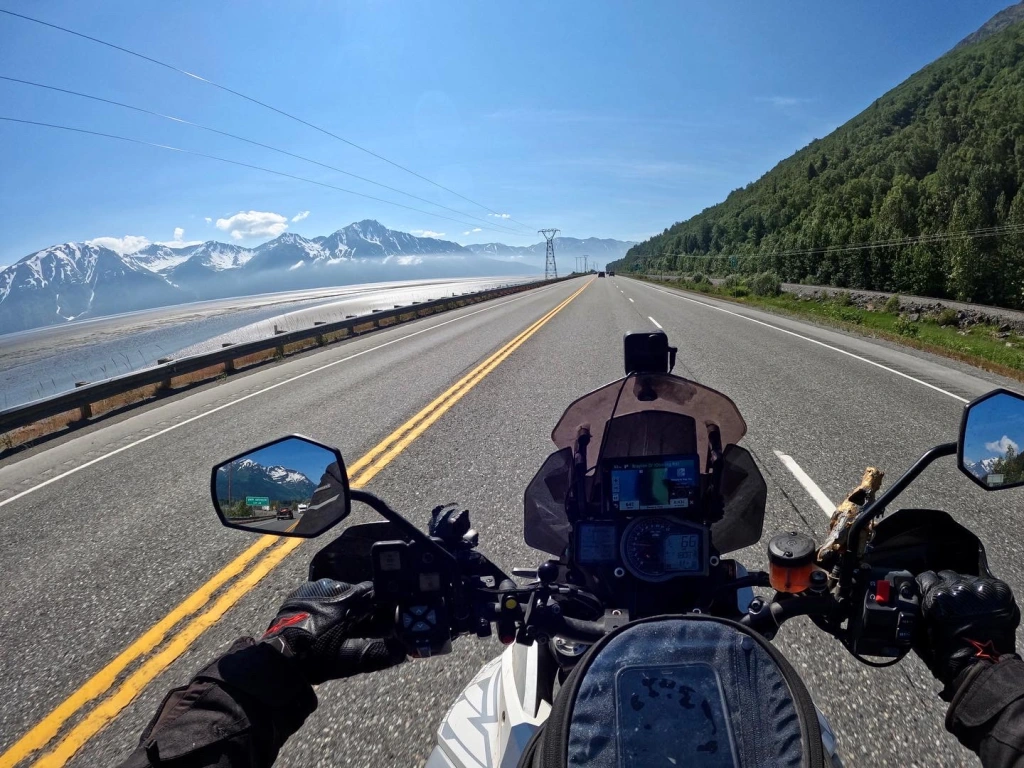 I took the opportunity to go check out Portage glacier and the town of Whittier. Portage glacier was just another beautiful mountain with a glacier on it towering over a ridiculously beautiful glacial lake….more of the usual. But visiting Whittier requires a trip through a tunnel. And not just any tunnel. A one lane tunnel. Traffic switches direction every half hour. And the tunnel has a metal floor and train tracks down the middle. Motorcycles have to ride between the tracks which is about 4ish feet. Getting too close to the track will pull your tire into the gap and almost certainly cause a crash. O yeah and the tunnel is 2.5 miles long. Perfectly. Straight. It was kinda tough but mostly fun.