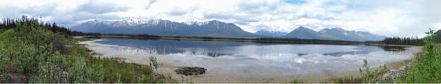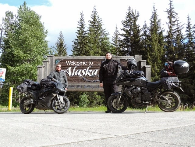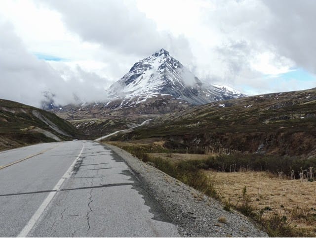 Most of our ride was on road we had already covered and it was the least interesting scenery too so there are no pictures from the first part of the day. There are however some videos showing how completely ruined the Alcan highway is. When we were planning this trip everyone said to watch for road construction and frost heaves (water gets under the road then freezes and lifts the road. Then when it melts it leaves behind a gigantic dip in the road). The Alcan highway between the Canadian border and Beaver Creek is so bad….it was like riding a motocross course. We don’t have any pictures to prove it but there were two times that both our bikes were in the air…..saw it with my own eyes and Enrique saw me later. And then there was the “construction”…….apparently Canada thinks that throwing gravel in SOME of the millions of pot holes is sufficient. All it does is spread loose gravel all over the road. So…..if you ever ride the Alcan highway……be very careful! It’s in terrible shape towards the end. And also….if I ever hear someone back home complain about road construction or how bad the road is…..I’m going to punch them right in the face.