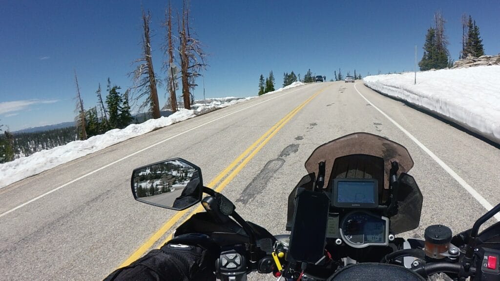 The Highway goes through national forest all the way to Evanston Wyoming. The coolest part is that it takes you right over a mountain all the way up to 10,700 feet. We made our way up to the top expecting cold temps and maybe a little snow….there is still a lot of snow up there! Obviously we weren’t going to camp in the snow so we headed down the other side of the mountains in search of warmer temps and hopefully somewhere greener to camp.